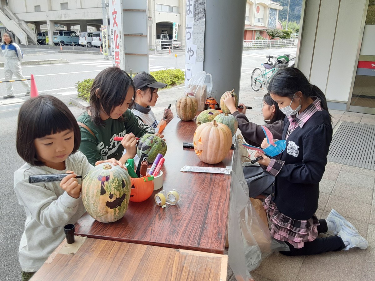 「宝探し」だけでなく、宇山から持ってきてもらった、ツルの先で実になった、熟していない食べても美味しくないかぼちゃに、「かぼちゃにらくがきしてみよう!」 と10個ほどを並べておくと、熱心に挑戦してくれる子たちもいて盛り上がりました。